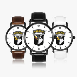 - 82nd Airborne Division-Ultra Thin Leather Strap Quartz Watch (Silver With Indicators)